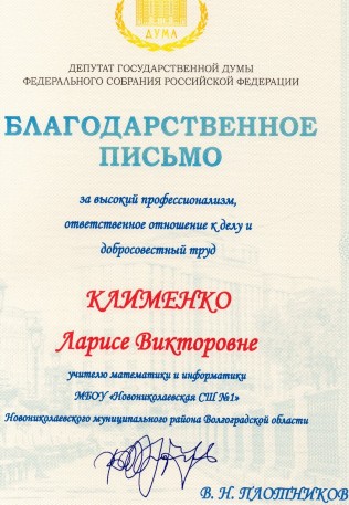 Персональный сайтКлименко Ларисы Викторовны,учителя математики, информатики МБОУ "Новониколаевская СШ№1"